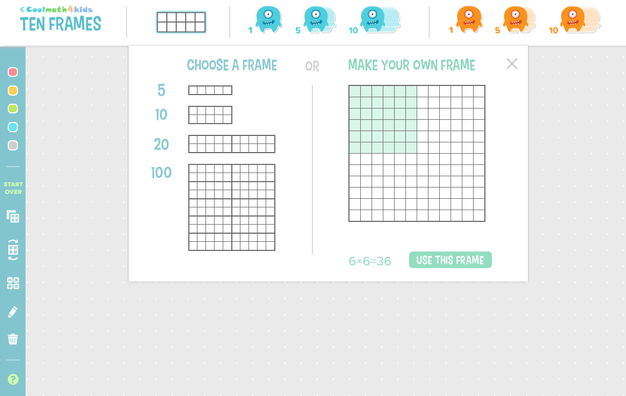 Work with multiple sizes of provided ten frames or create a custom size frame